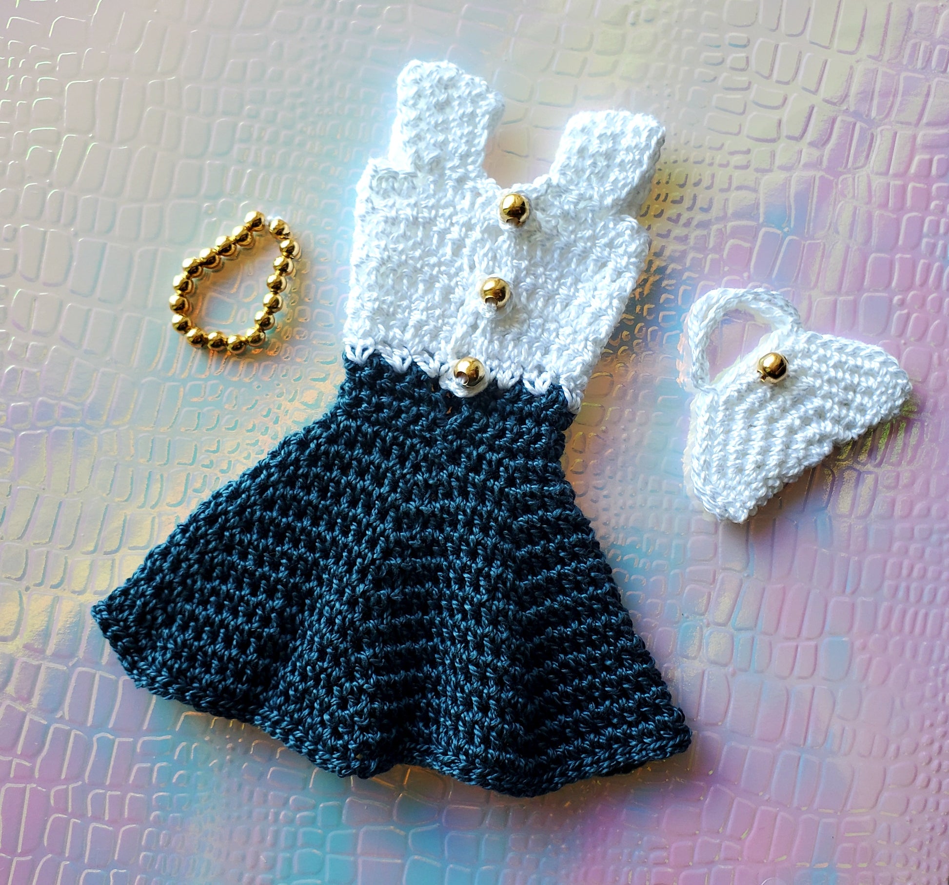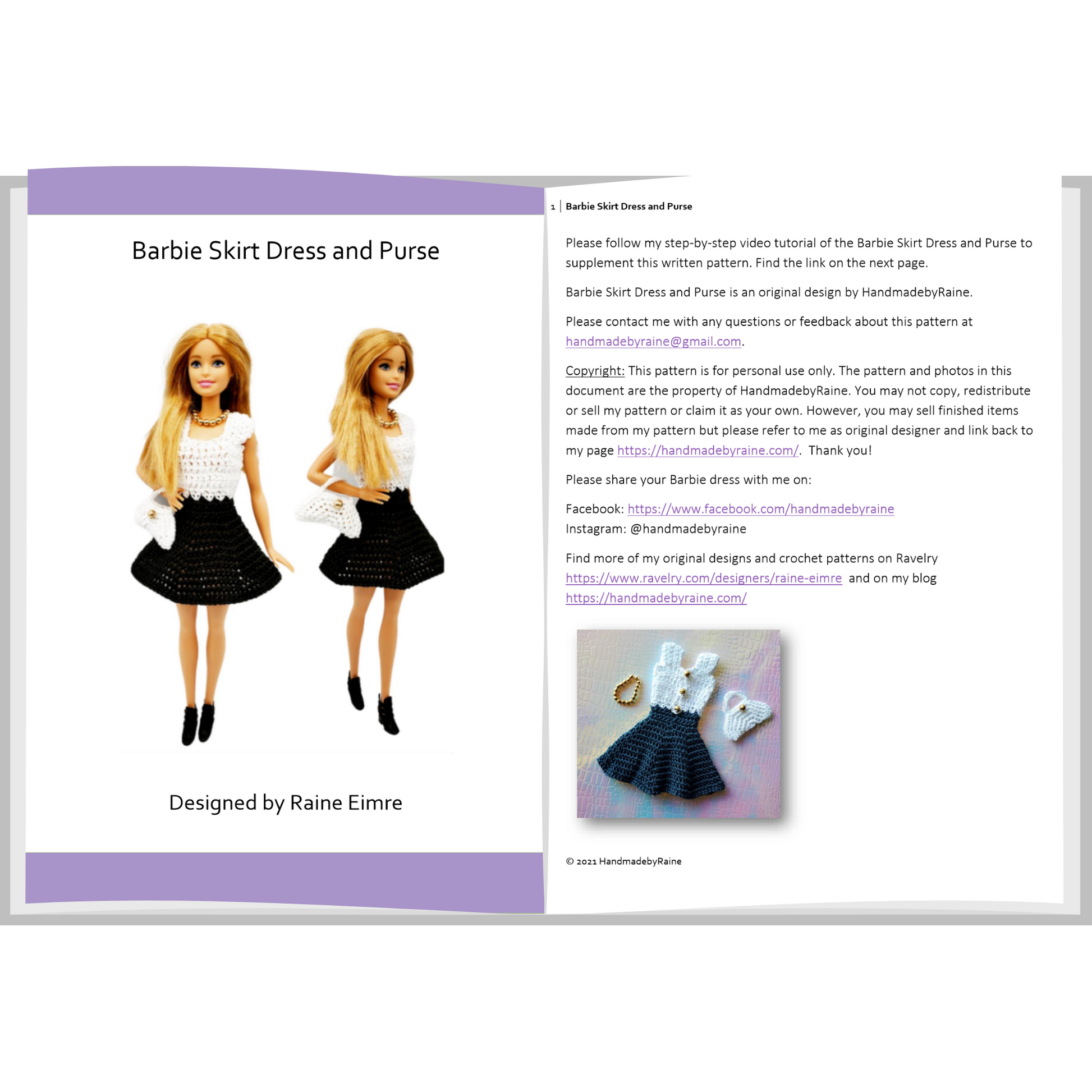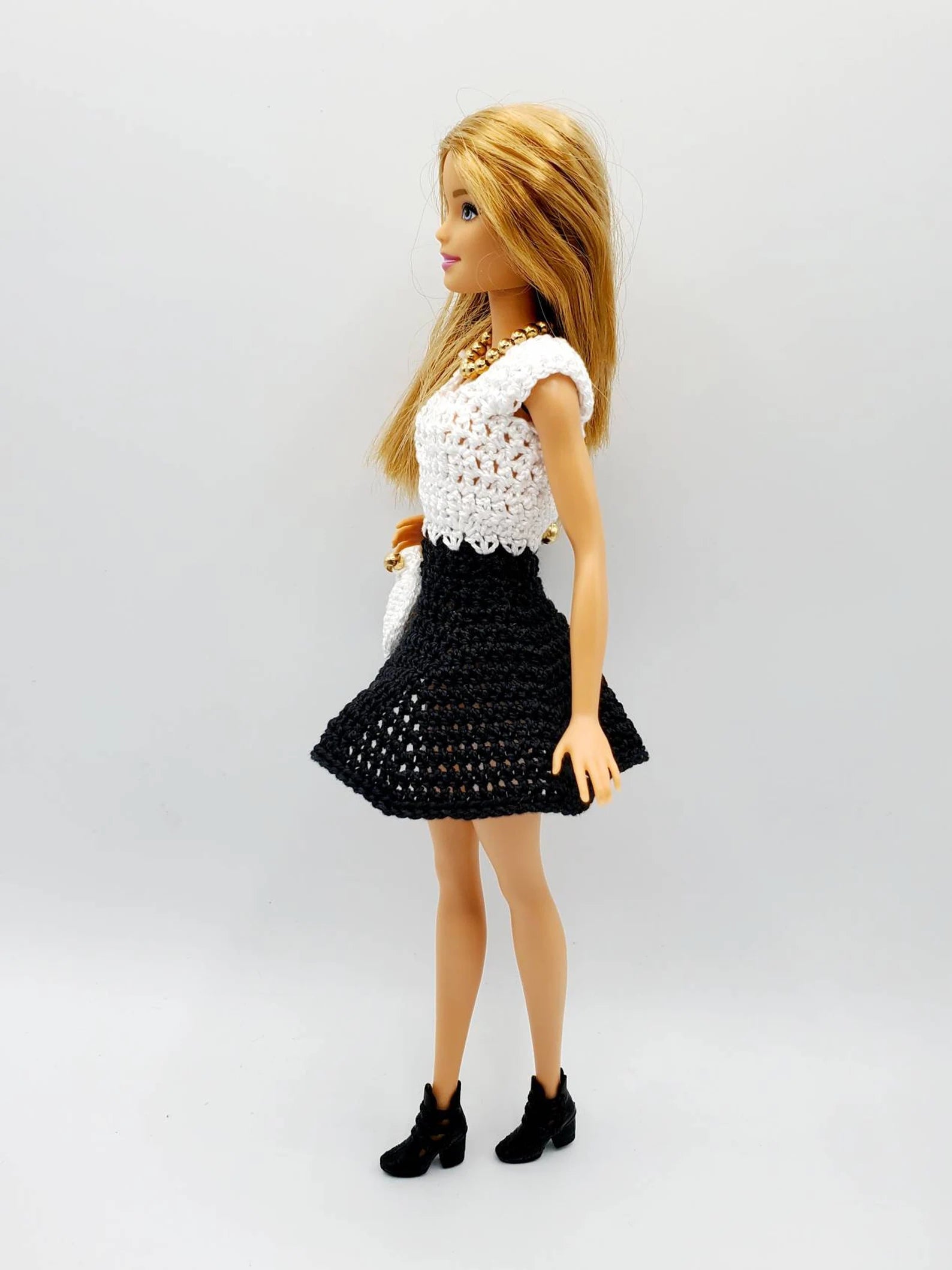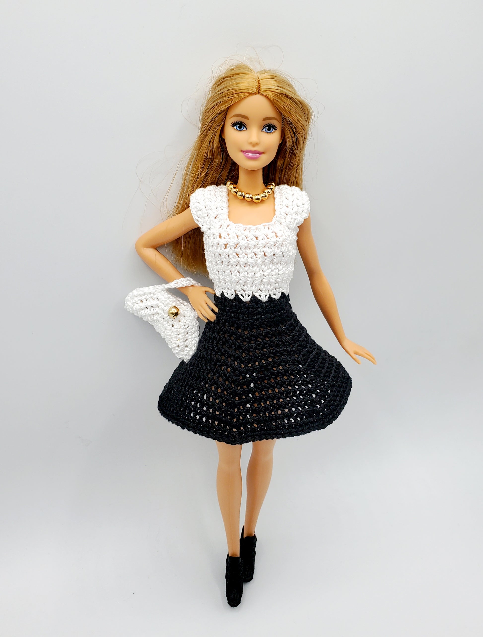 Barbie is so classic, so let's crochet her another dress, this time it’s the elegant black and white Skirt Dress. The pattern also includes instructions to make the little fancy purse to complete the look!