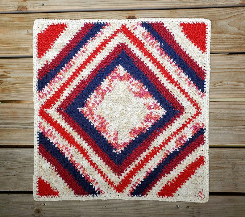 You have a choice of making 4×4 square rug as shown here or keep adding squares to make a blanket.