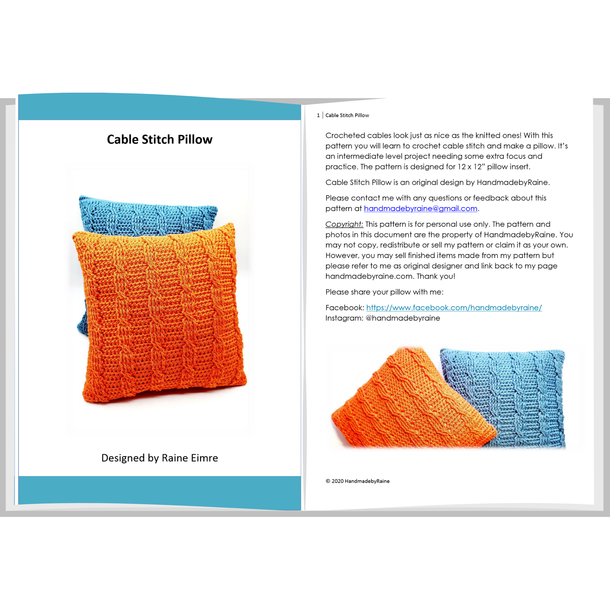 Crocheted cables look just as nice as the knitted ones! With this pattern you will learn to crochet cable stitch and make a pillow. The pattern is designed for 12 x 12” pillow insert.