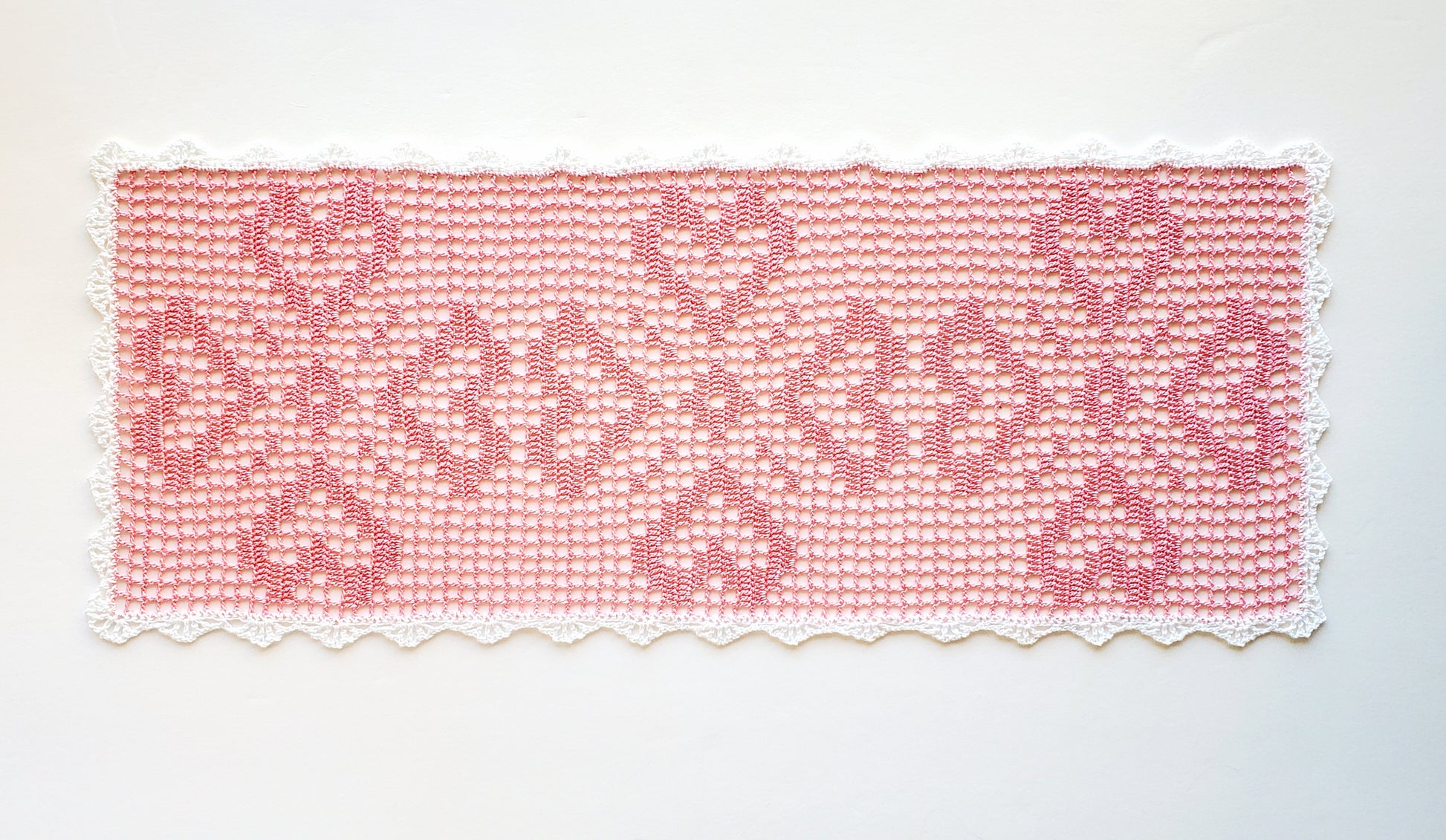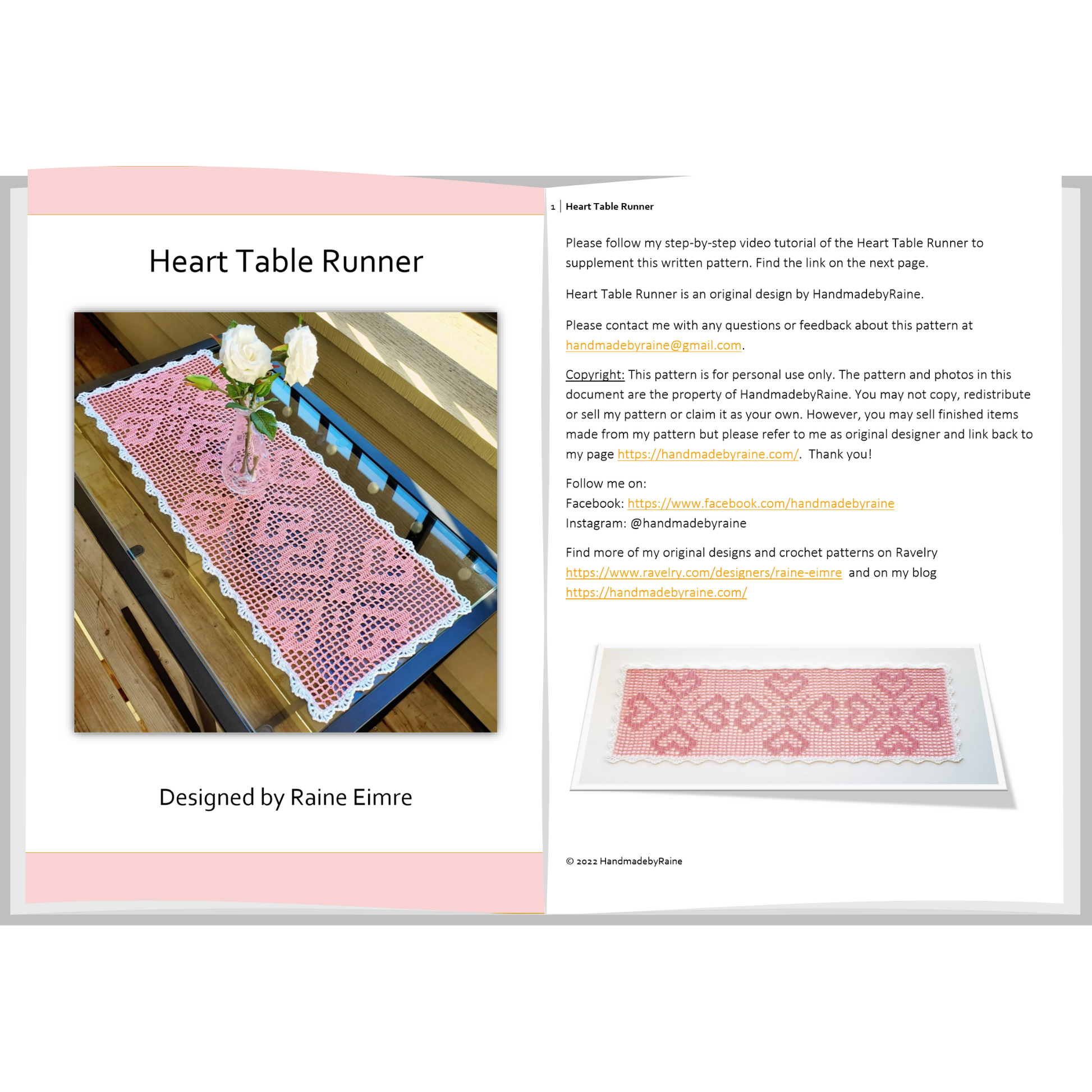 Table Runner is made in 2 steps: first the hearts in filet crochet technique following the chart, then adding the edge in 2 rounds using a contrast color thread.