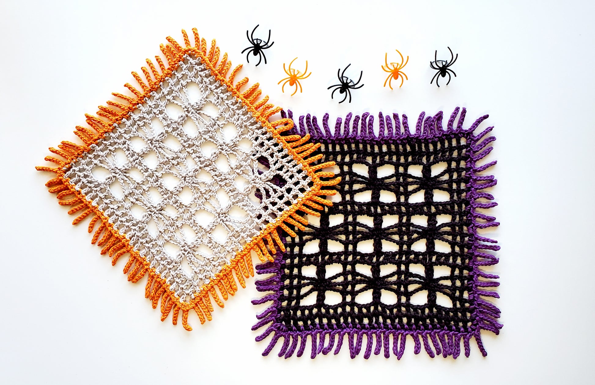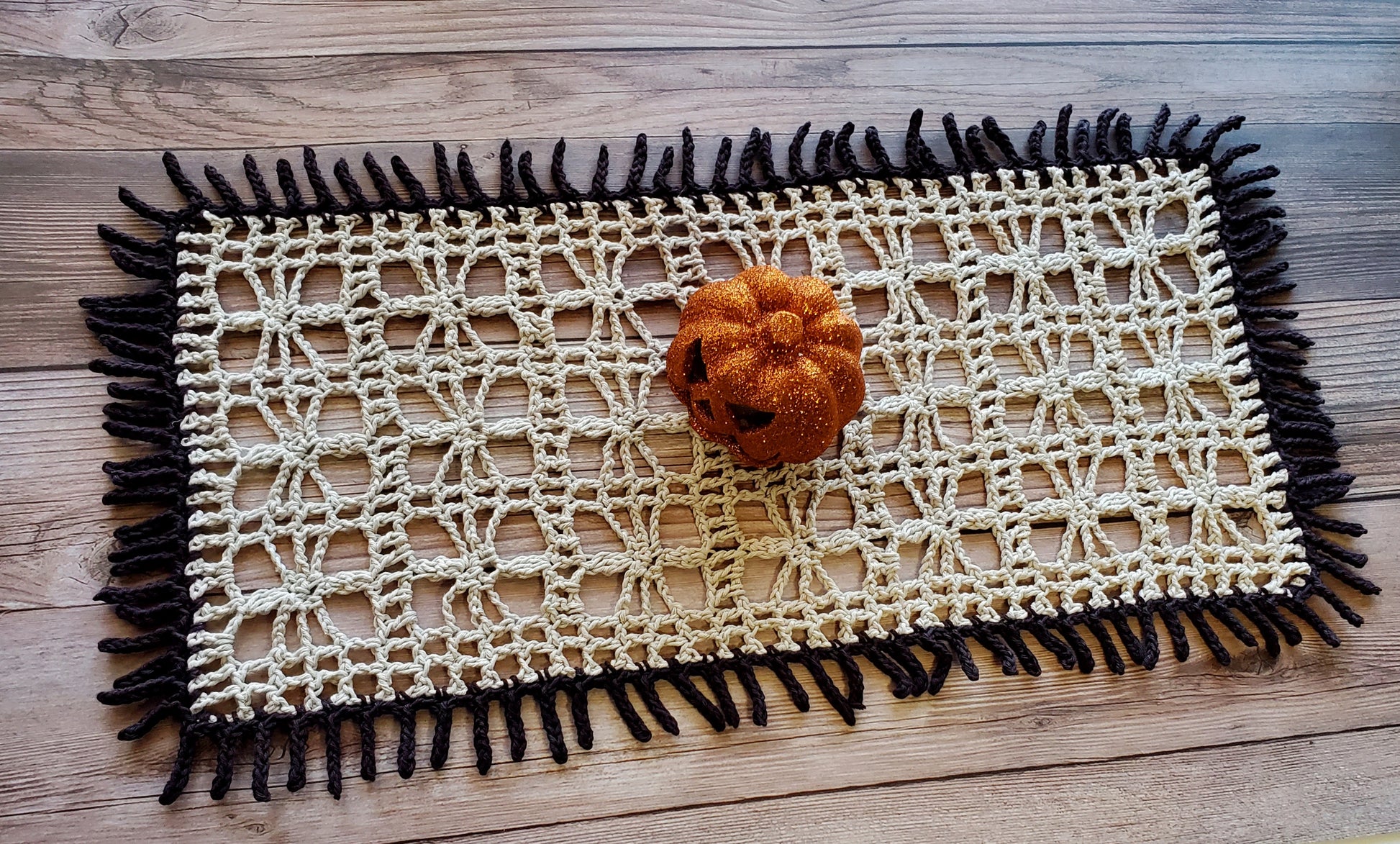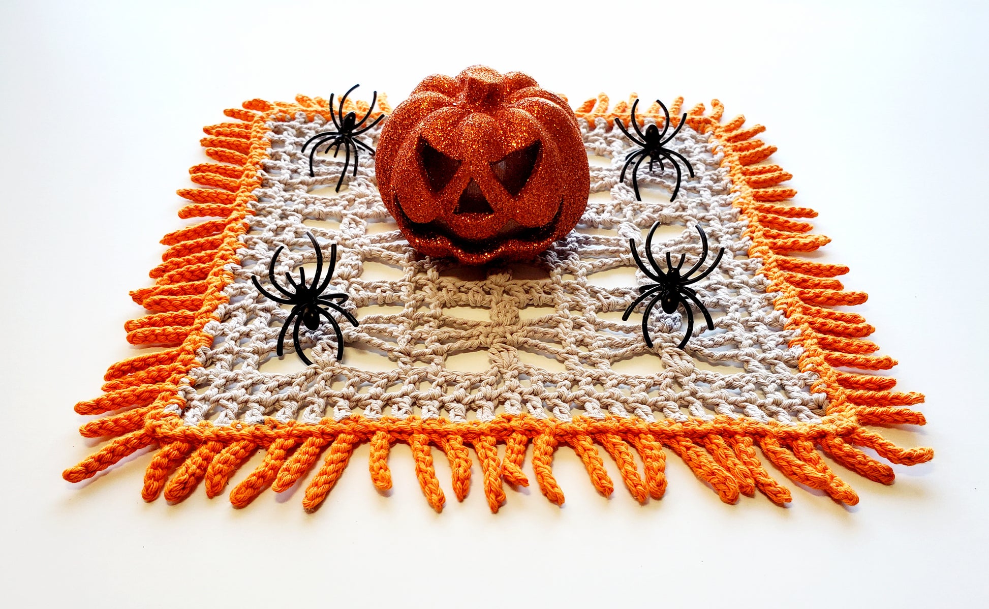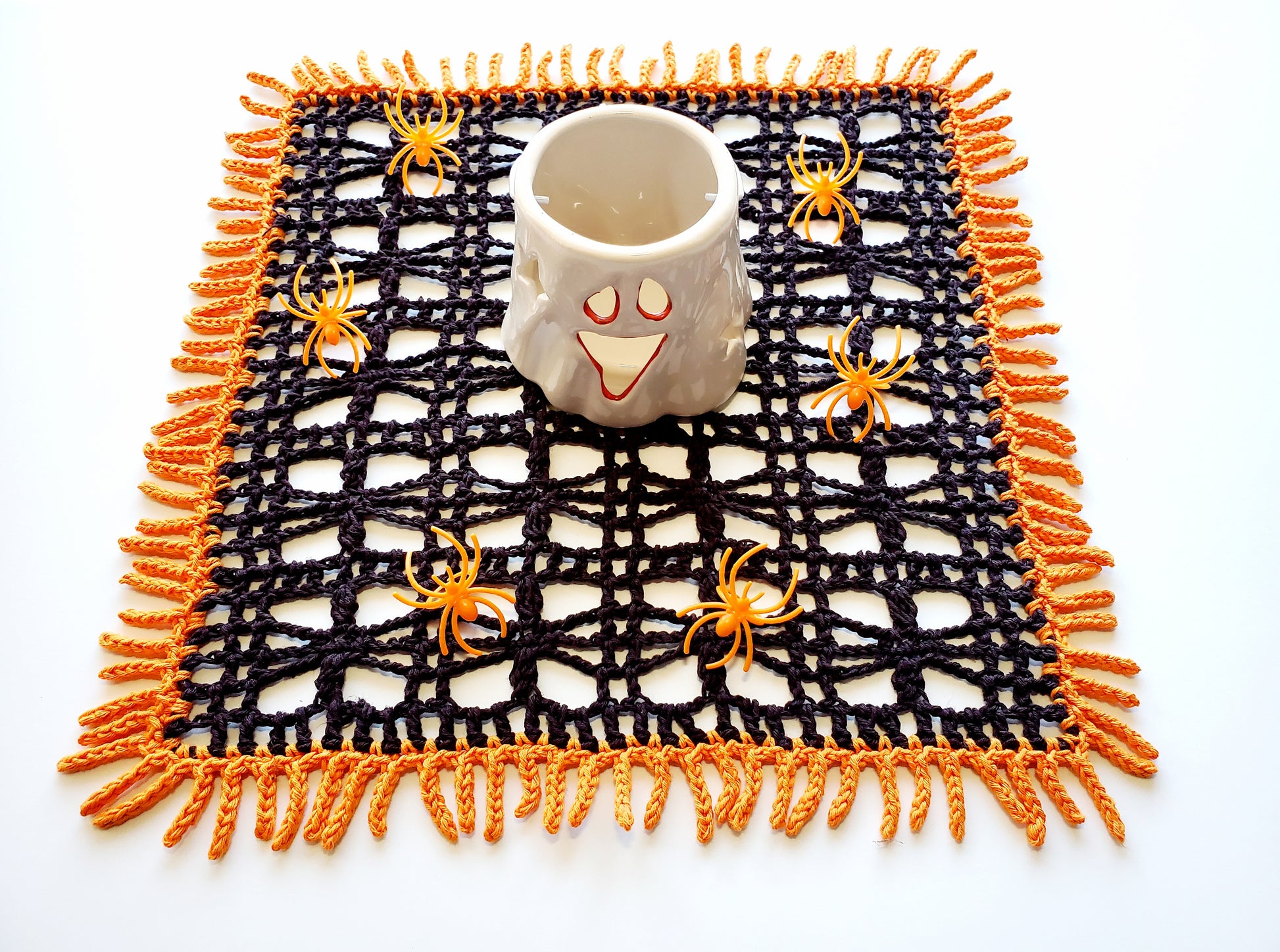 The Little Spider Tablecloth is quick and easy to crochet and it makes a great Halloween decoration.
