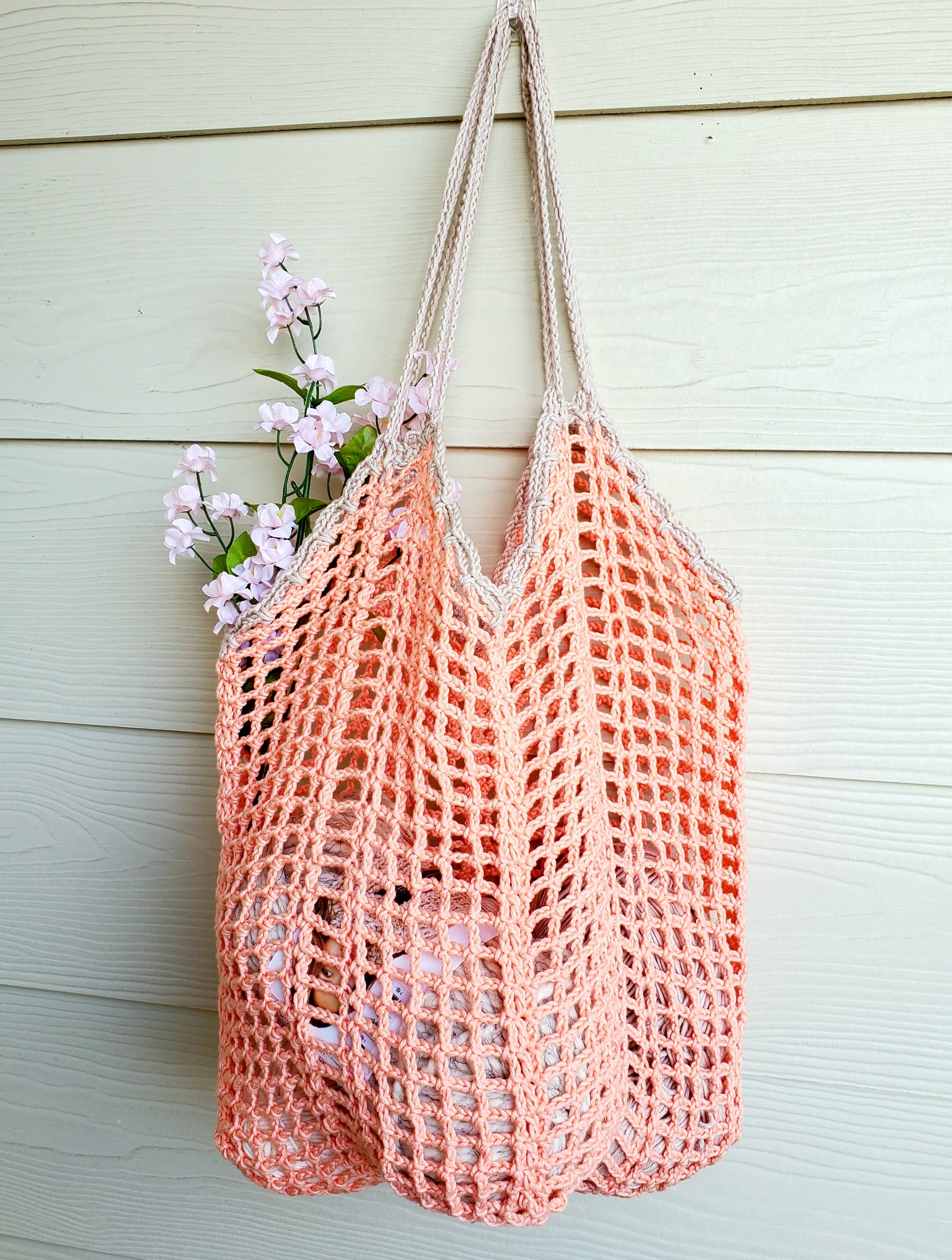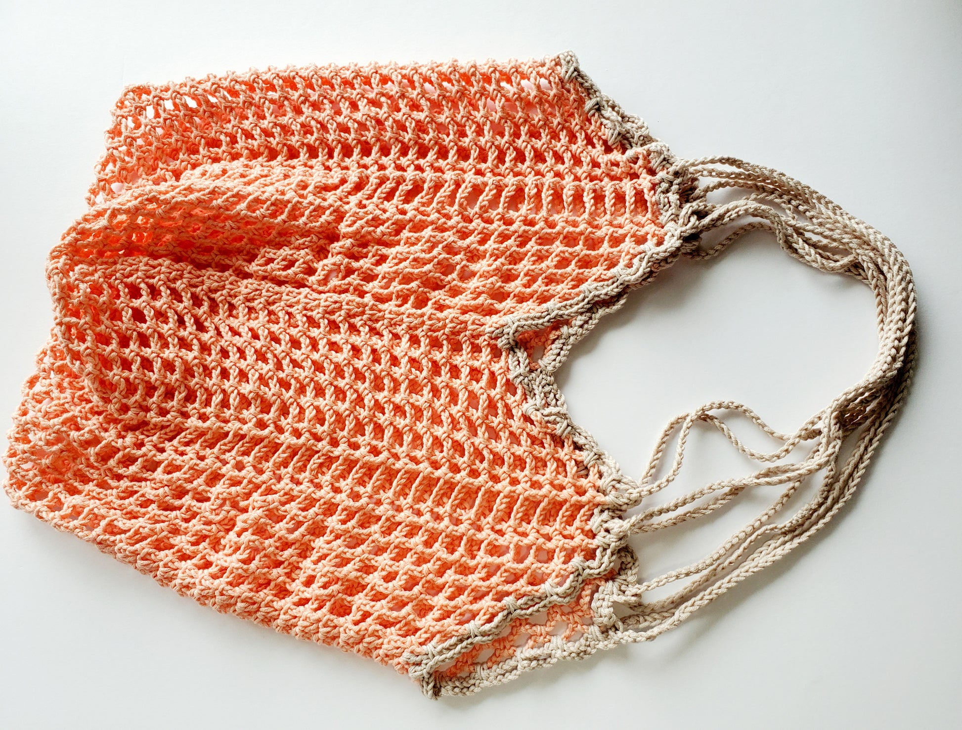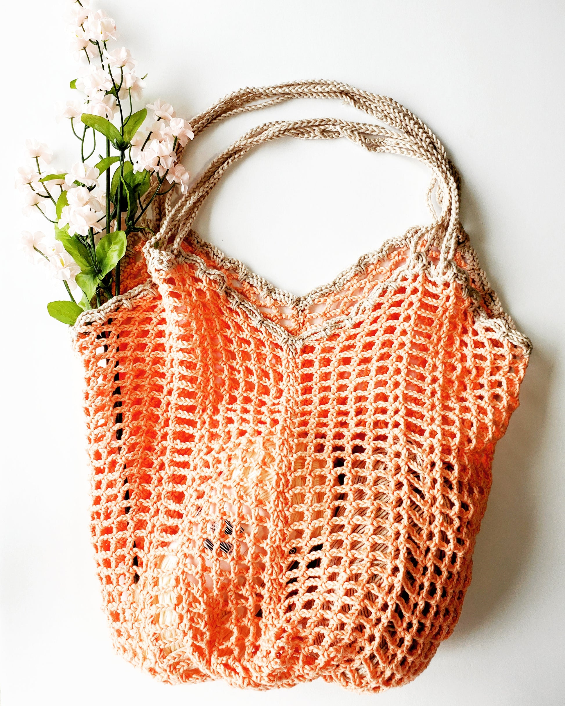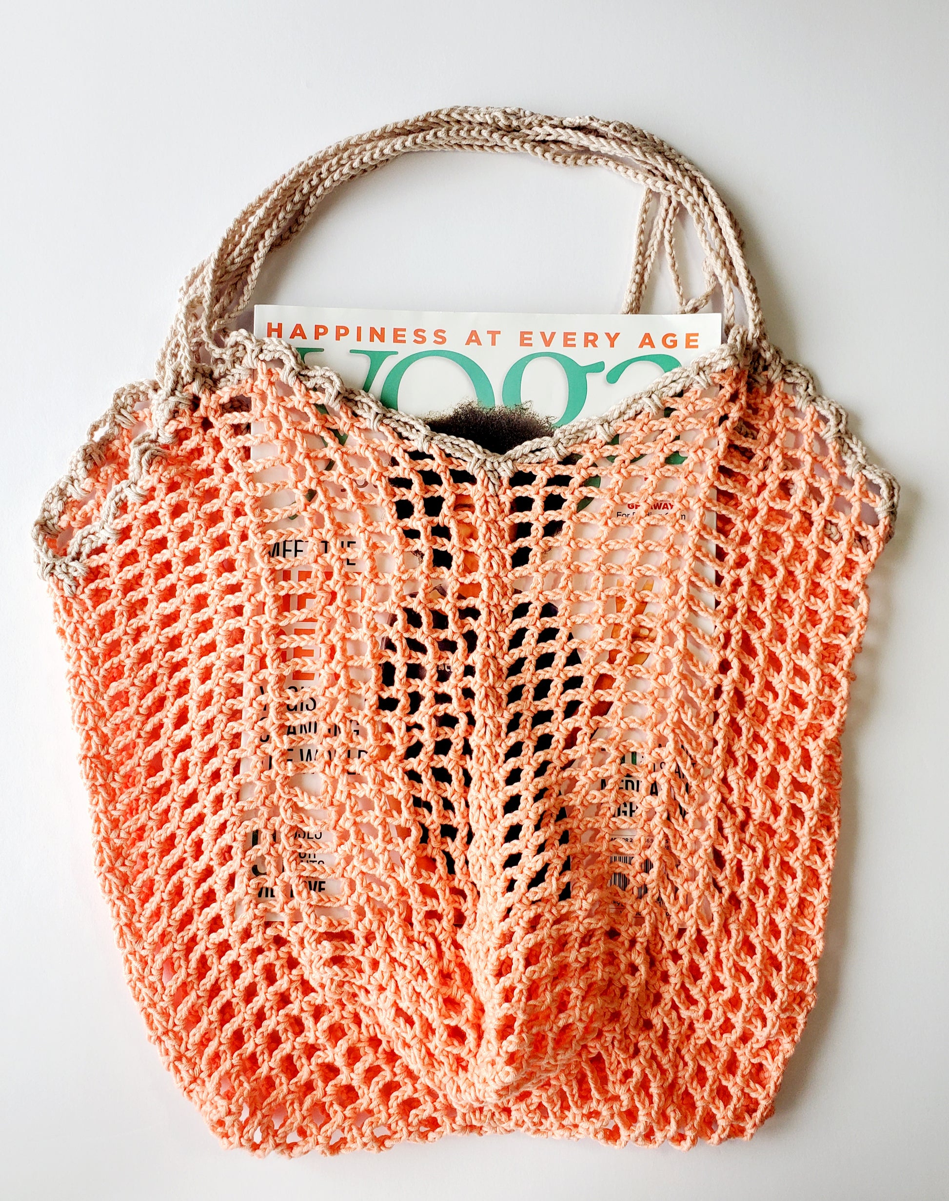Why do I call this market bag a Network Shopper? First, the checkered pattern of chain-spaces looks like a net, so this is a “network of chains”. And second, “shopper” is a cool alternative to “market bag”, so why not mix things up a bit.