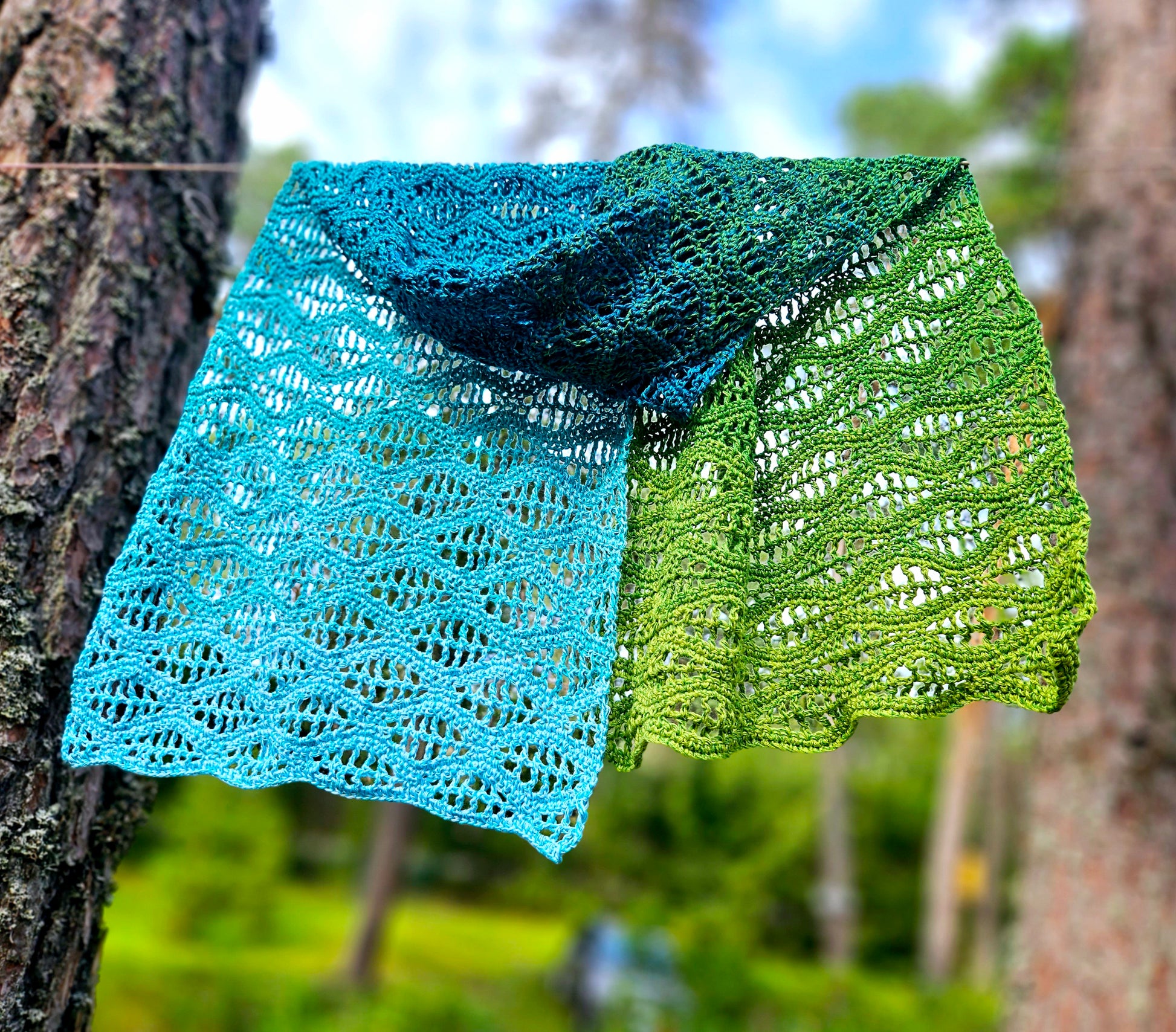The pattern is multiple of 16 + 2, so it’s easy to adjust the width of the shawl. Using one ball of color Seaglass my shawl measures about 13.5 inches wide and 51 inches long.