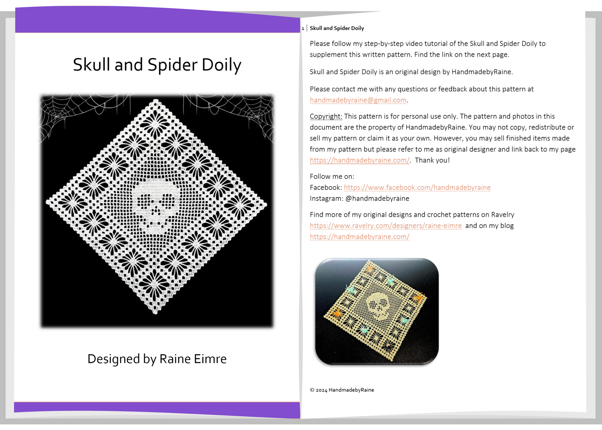 The Skull and Spider Doily blends the traditional crochet method to create the intricate frame of spiders encircling the skull, while using the filet crochet technique to create and position the skull at the centerpiece.