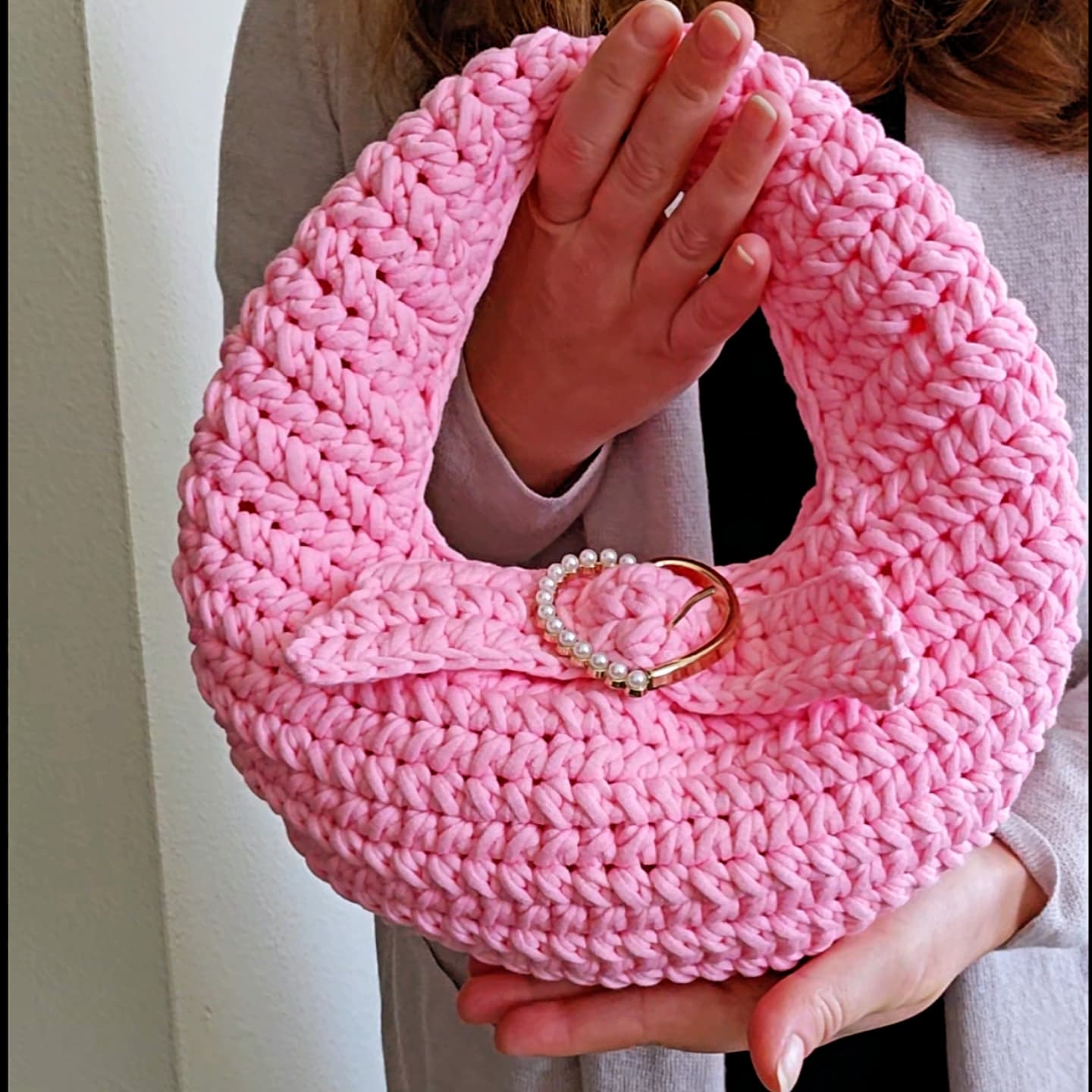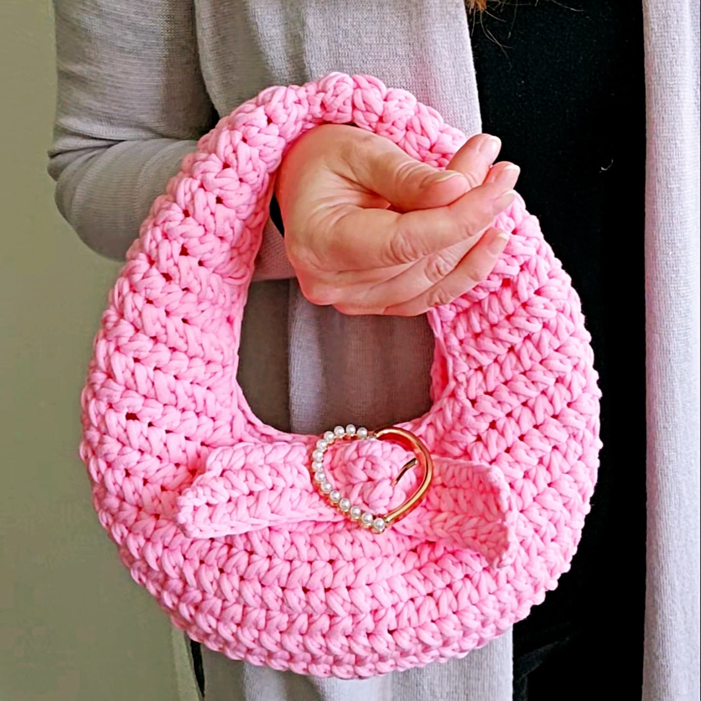 Made with soft, high-quality T-shirt yarn, the purse boasts a smooth, luxurious texture. You can personalize it with stylish embellishments to reflect your unique style, for example by adding the heart-shaped buckle.