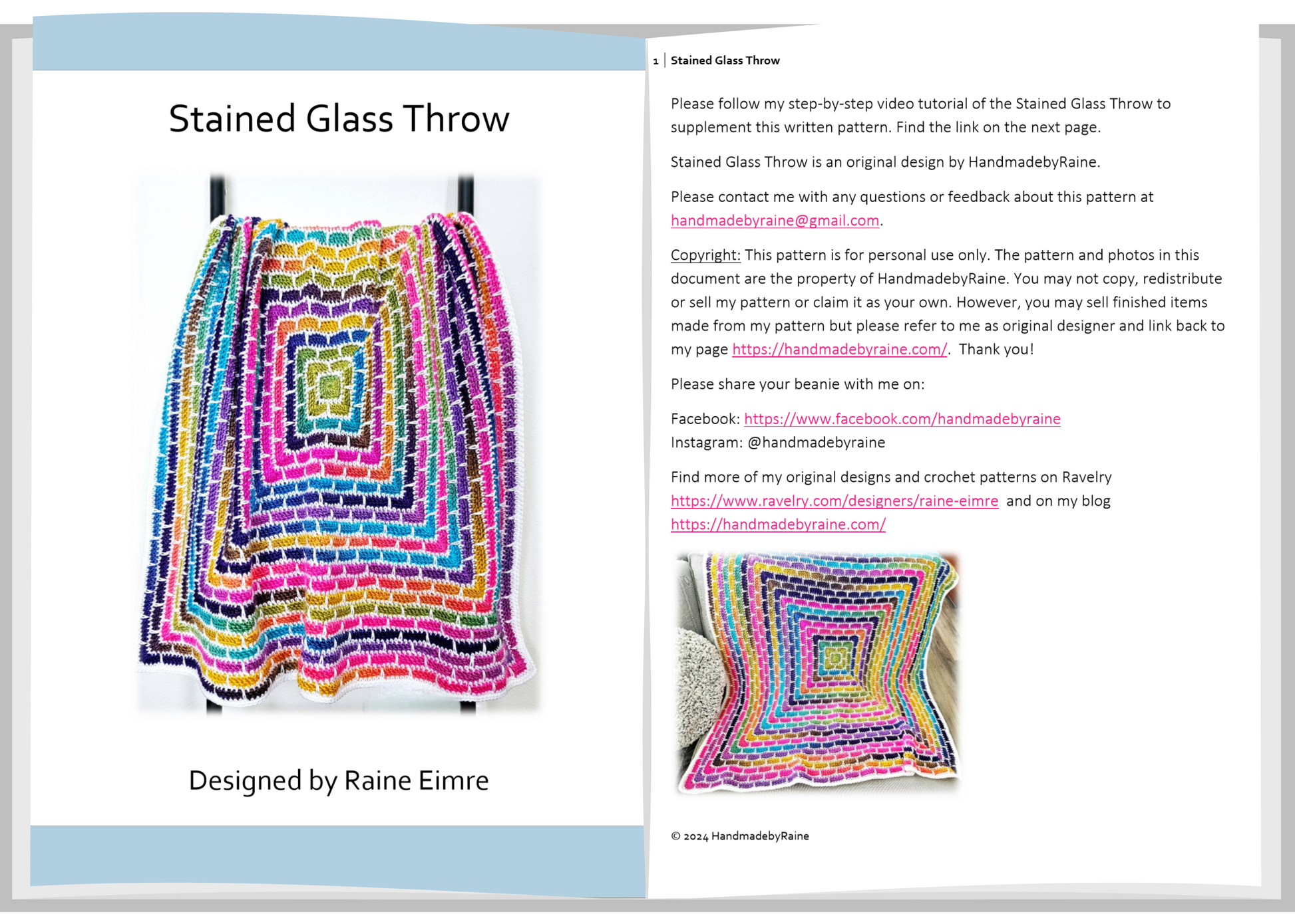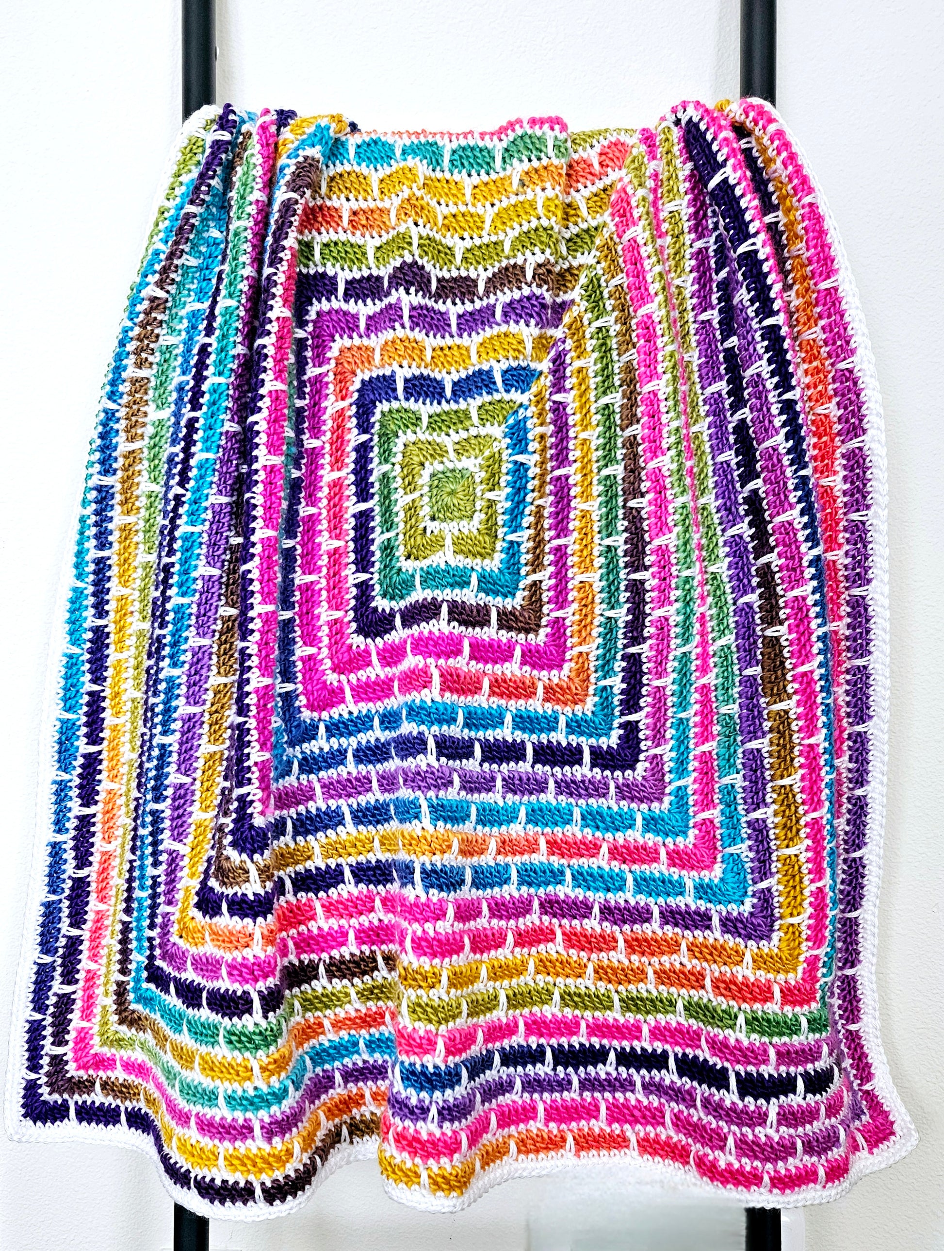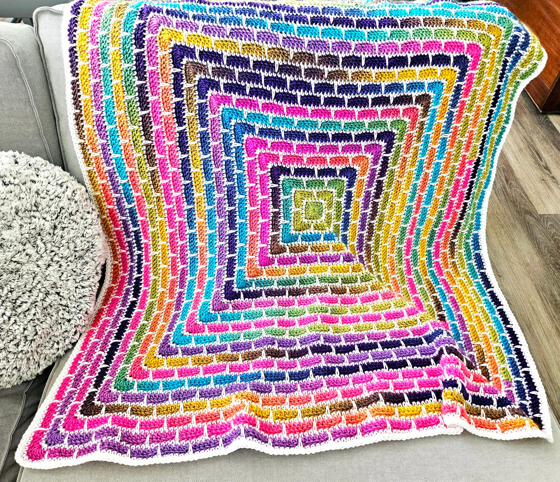 The Stained Glass Throw is an easy crochet pattern to make the stunning colorful square shaped blanket. It starts out as a square crochet motif using two yarns, and then simply adding rounds to make it your preferred size, you will end up with a much bigger square of the throw.
