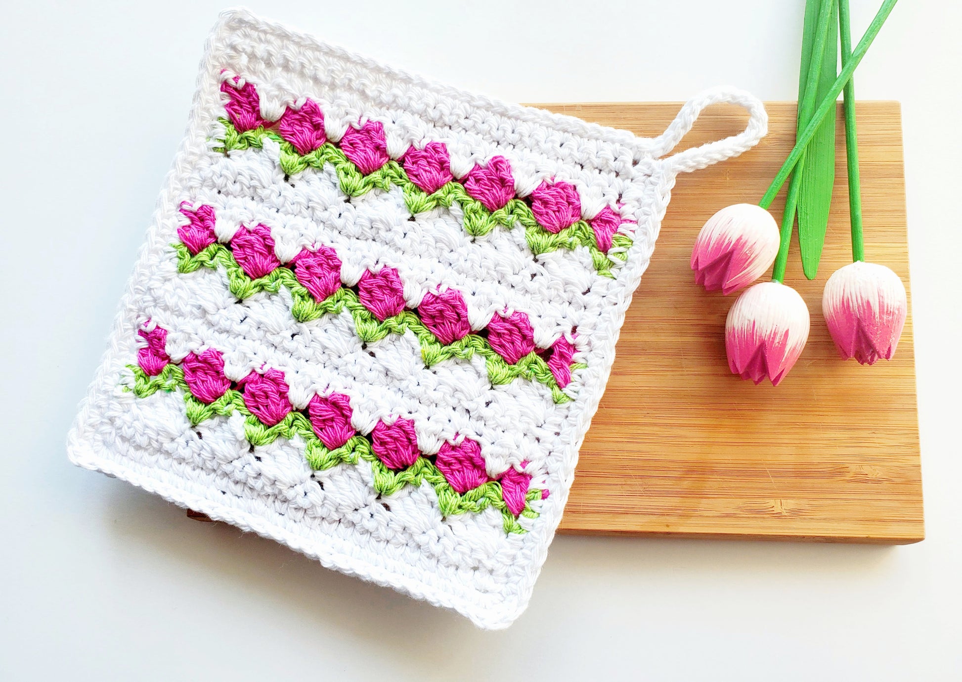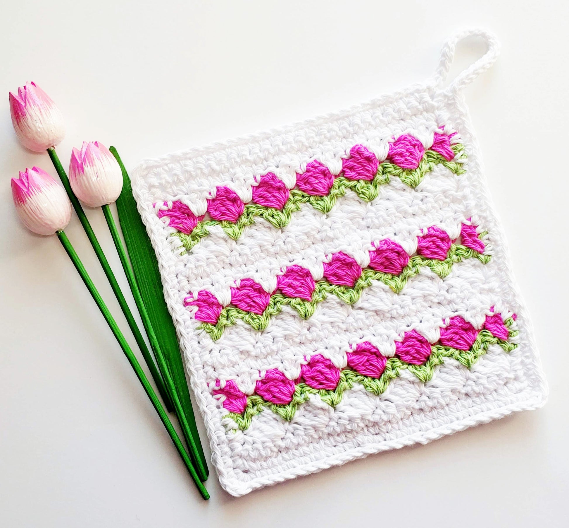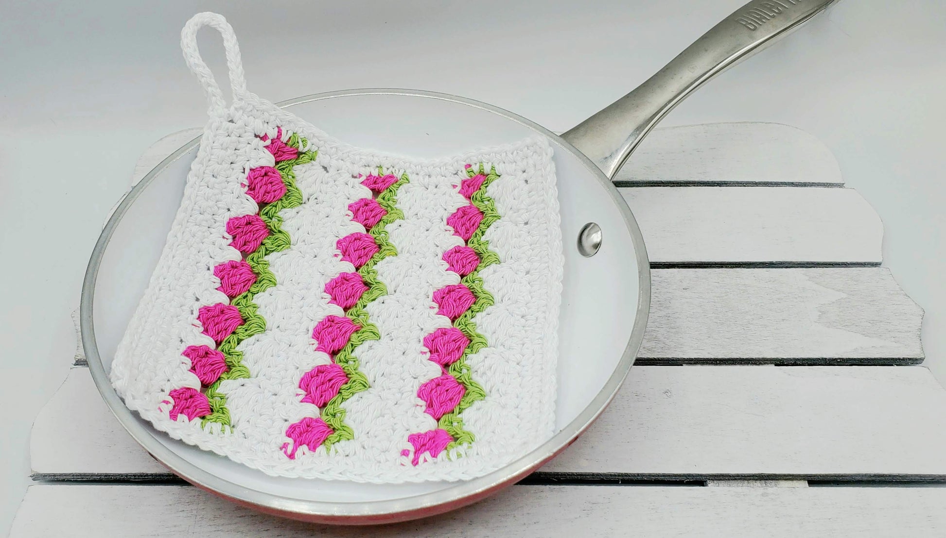 Add springtime fresh and colorful vibes to your kitchen and crochet the pretty tulip stitch dishcloth.