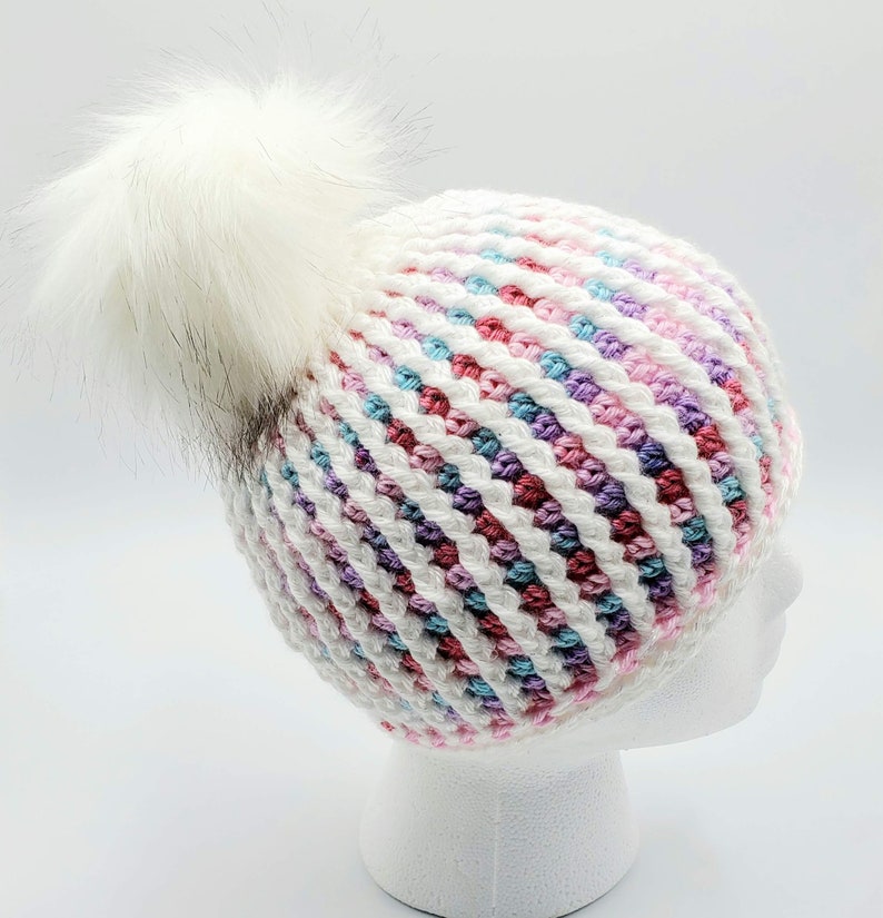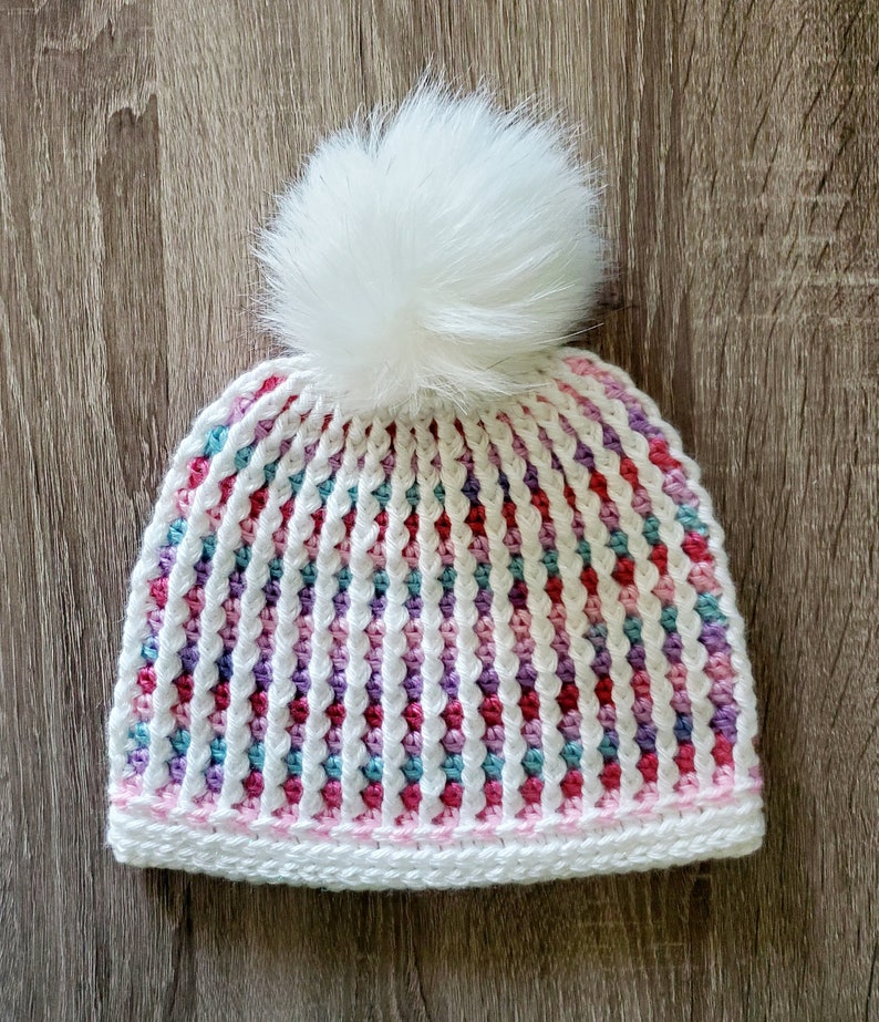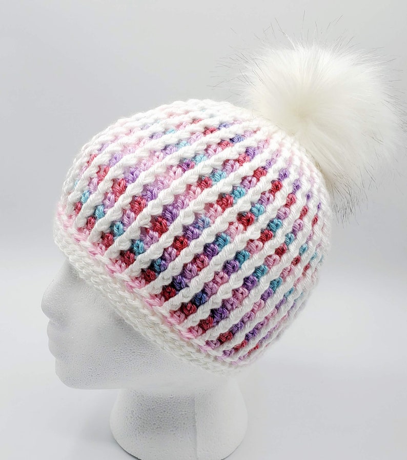 And this is a great hat to crochet if you are up for somewhat more challenging work. You will practice front post double crochet stitches while changing contrast color yarn with each stitch.